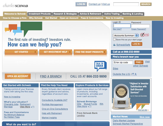 嘉信理财是一家投资公司,在不稳定的市场环境下他们需要让消费者在他们的网站上感受到平和。他们使用柔和的深蓝色调来实现这一点,并建立起一种平 静、祥和的气氛。中性的棕色则是另一种帮助协调偏激的用户感受的企业色彩。橙色作为强调色,能让用户在买股票时产生兴奋感,同时也为网站带来了幸福感。